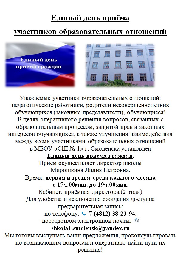 МБОУ «Средняя школа №1» города Смоленска – это школа, в которой для всех учеников создается особая, творческая, доброжелательная атмосфера. Увлекательные уроки, общешкольные праздники, соревнования, концерты, фестивали, творческие игры – вот то, чем живут наши учителя и ученики.
